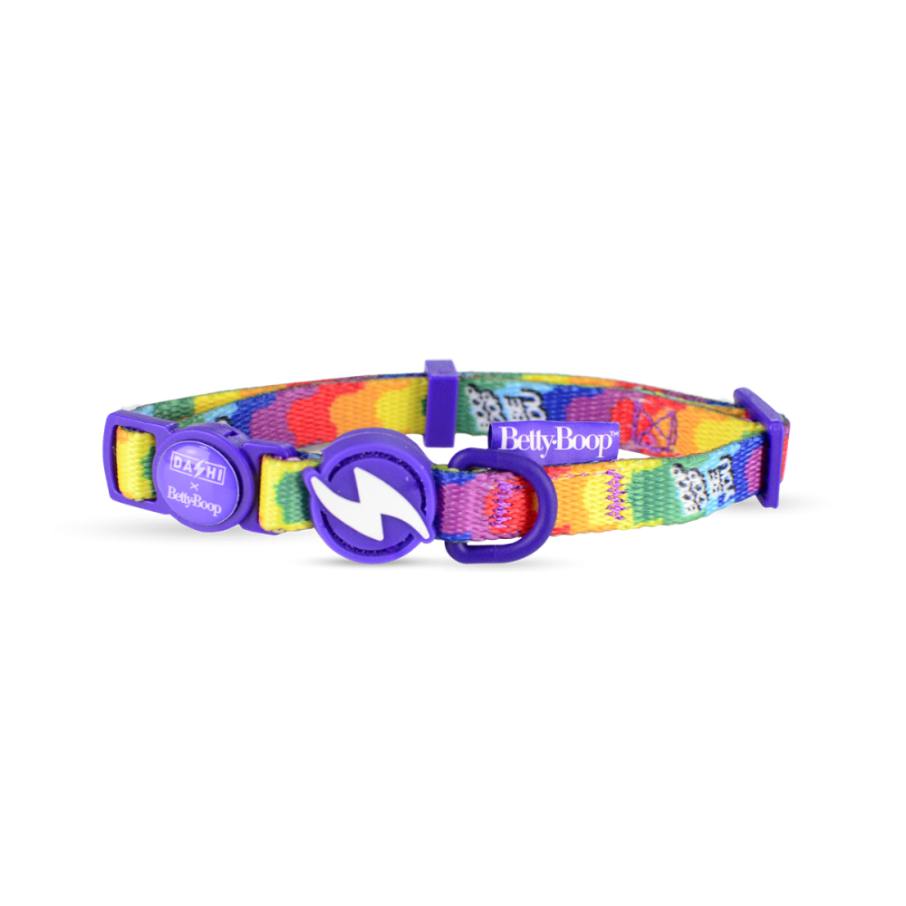 Dale un toque de color y estilo único a tu gato con el collar “Betty You” de la colección oficial Betty Boop x Dashi®. Diseñado para los felinos más coquetos y divertidos, este collar combina un estampado vibrante multicolor con detalles en púrpura que destacan por su originalidad y buen gusto.