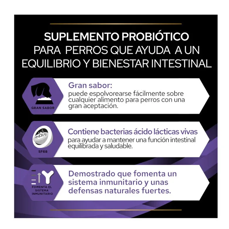 - Complemento probiótico para cachorros y perros adultos.