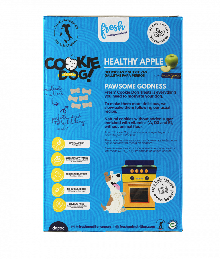 Todas las recetas Fresh Cookies se han desarrollado de acuerdo a las recomendaciones de expertos para que estas galletas sean tanto nutritivas como saludables. Son ideales como premio, recompensa o durante la etapa de adiestramiento. Además, su origen 100% vegetal hace que tanto las Healthy Apple como el resto de variedades Fresh Cookies sean compatibles con una dieta vegana.