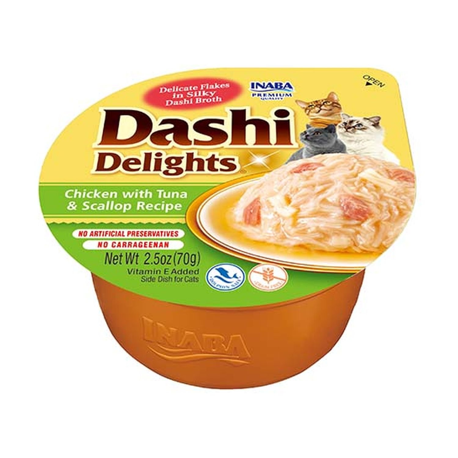 Dashi Delights de pollo con atún y vieira para gatos de Inaba es un caldo de pollo con atún, tradicional japonés a base de hojuelas de atún y vieira listado, famoso por su rico sabor. Este manjar único es altamente hidratante, rico en proteína animal y no contiene cereales, aditivos indeseables ni ingredientes artificiales.