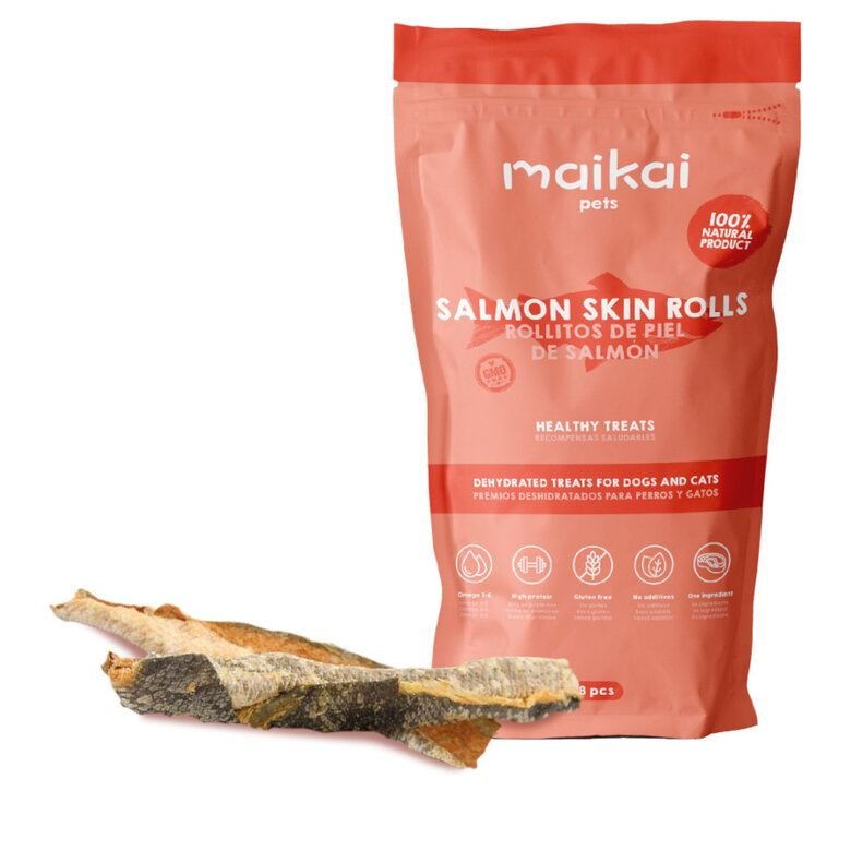 Palitos masticables de piel de salmón ahumado sin procesar, sin gluten, sin colorantes, ni conservantes ni aditivos. Son saludables, nutritivos, bajos en grasas y altos en proteínas (54%).