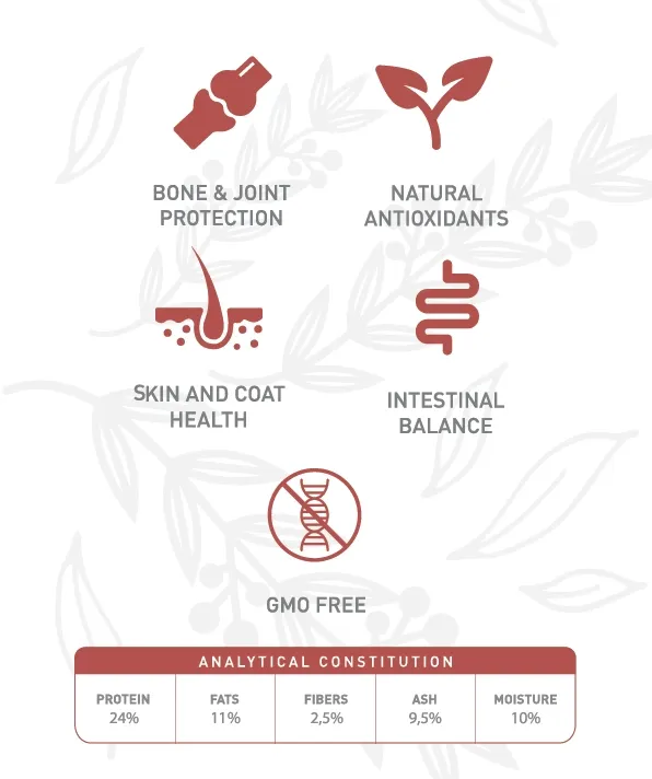 Proteína: 24%; Grasa: 11%; Fiber: 2,5%; Ashes: 9,5%; Humedad: 10%.