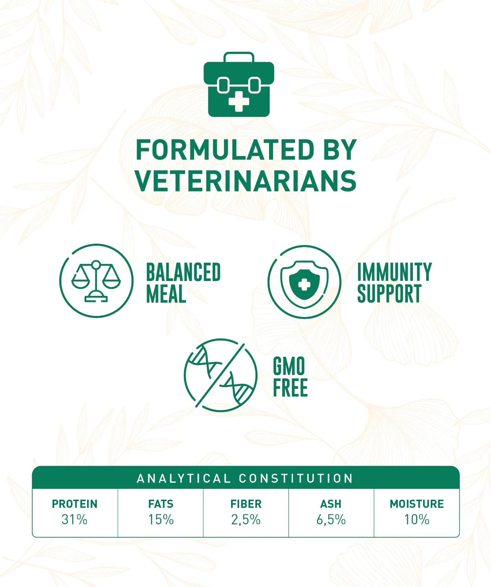 COMPOSICIÓN ANALÍTICA | Proteína: 31%; Grasa: 15%; Fibra: 2,5%; Ceniza: 6,5%; Humedad: 10%.