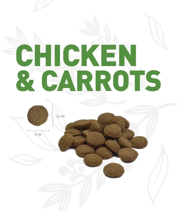 Pienso con pollo y zanahorias para perros adultos.
