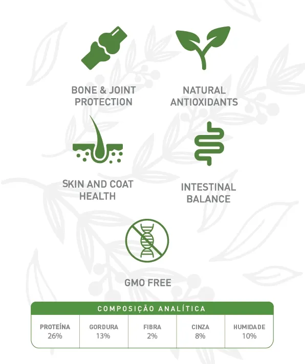 Proteína: 26%; Grasa: 13%; Fibra: 2%; Ceniza: 8%; Humedad: 10%.