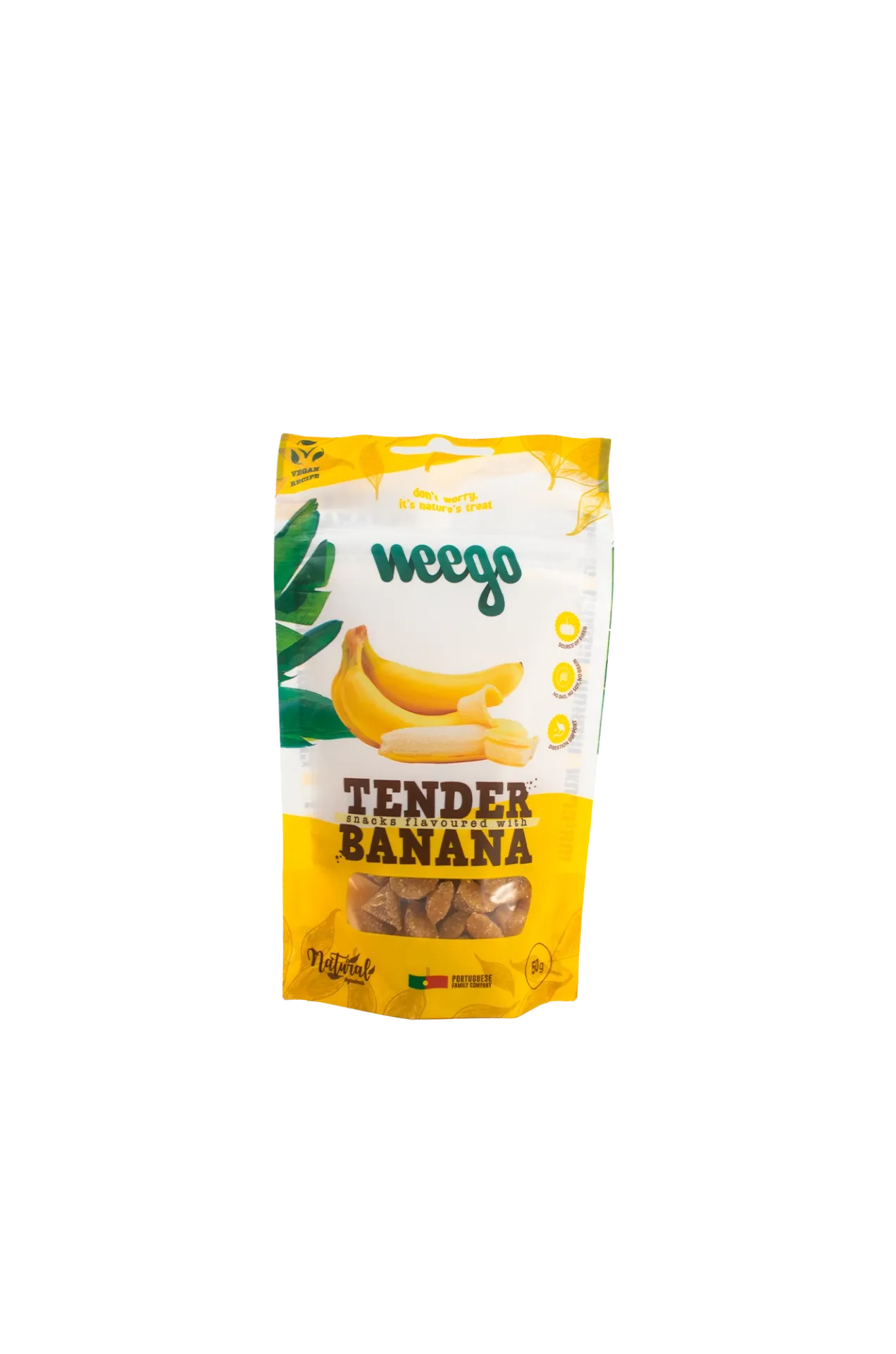 Weego® Tender Snacks Banana es un snack vegano complementario sin grano para perros con sabor a plátano.