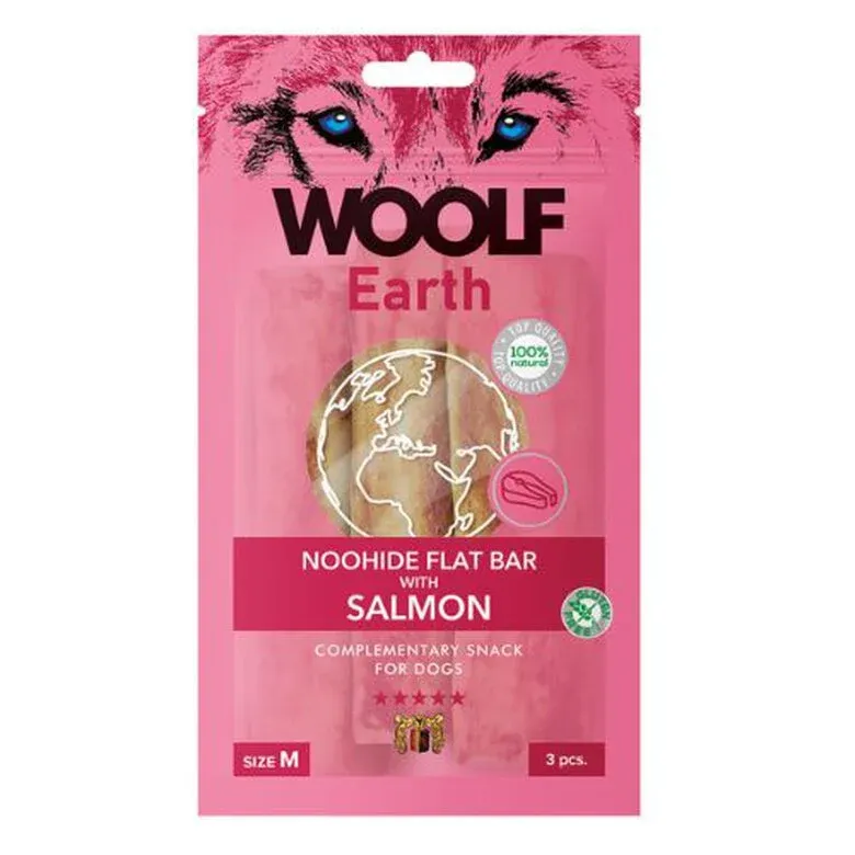 Woolf Earth Noohide M Barrita Plana con Salmón. Alimento complementario sin cereales para perros pequeños. Para su elaboración solo se utilizan ingredientes naturales de calidad. Woolf Earth no contiene aditivos, cereales ni azúcares.
